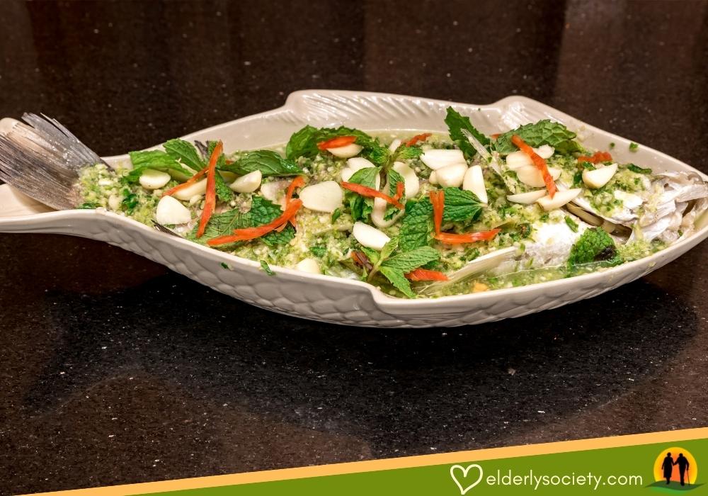 พระเอกของเมนูนี้คือปลากะพงเป็นโปรตีนดีที่ย่อยง่ายและยังอุดมไปด้วยไขมันดีอย่างกรดอีโคซะเพนตะอีโนอิก และกรดดีเอชเอช่วยขจัดไขมันเลวที่จะไปอุดตันหลอดเลือดหัวใจ และยังมีสมุนไพรต่าง ๆ ที่ดีต่อสุขภาพด้วย