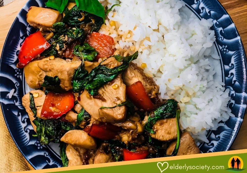 เมนูนี้อุดมไปด้วยสารอาหารครบทั้ง 5 หมู่ โปรตีนจากไก่ แร่ธาตุและวิตามินจากใบกะเพรา พริก และกระเทียม คาร์โบไฮเดรตจากข้าว แนะนำว่าให้ใช้ข้าวไม่ขัดสีจึงจะดีกับสุขภาพ ส่วนน้ำมันควรใช้ไขมันดีซึ่งสูตรนี้ใช้น้ำมันรำข้าวช่วยลดความเสี่ยงของโรคหลอดเลือดหัวใจ