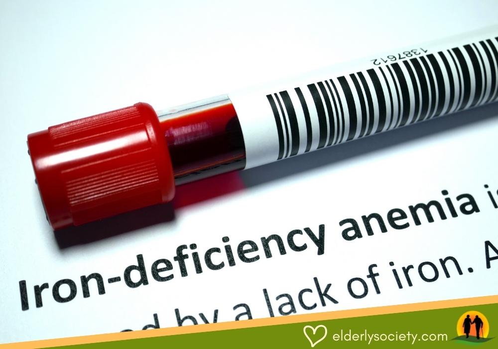 ภาวะโลหิตจางจากการขาดธาตุเหล็กเป็นสาเหตุที่พบบอยที่สุดของในผู้สูงอายุ ซึ่งสาเหตุของการขาดธาตุเหล็กส่วนใหญ่เป็นผลมาจากการเสียเลือดเรื้อรังจากทางเดินอาหาร เช่น แผลในกระเพาะอาหาร มะเร็งลำไสใหญ หลอดอาหารอักเสบและเนื้องอกในลำไส้ นอกจากนี้อาจเกิดจากการดูดซึมธาตุเหล็กที่ผิดปกติ เช่น การอักเสบของกระเพาะอาหารและลำไส้เล็กส่วนต้น เป็นต้น นอกเหนือจากอาการที่สังเกตได้ภายนอก เช่น เหนื่อยง่าย และอ่อนเพลีย นอกจากนั้นผู้มีภาวะโลหิตจางจากการขาดธาตุเหล็กยังมีอาการอื่นๆร่วมด้วย เช่น ริมฝีปากอักเสบแตกเป็นร่องและมุมปากอักเสบ เป็นต้น ซึ่งแพทย์จะทำการการวินิจฉัยด้วยการการตรวจสเมียร์เลือด ซึ่งจะพบลักษณะเม็ดเลือดแดงมีขนาดเล็ก และติดสีจาง หรือใช้การตรวจวัดค่าเฟอริติน (ferritin) ในซีรัม ซึ่งผู้มีภาวะโลหิตจางจะมีค่าเฟอริตินในซีรัมน้อยกว่าหรือเท่ากับ 12 ไมโครกรัมต่อเดซิลิตร ซึ่งแพทย์จะทำการรักษาด้วยการให้ธาตุเหล็กทดแทน 200 มิลลิกรัมต่อวัน เพื่อช่วยสร้างฮีโมโกลบินให้อยู่ในระดับปกติ ซึ่งใช้เวลาประมาณ 8 สัปดาห์ แต่หลังจากนั้นยังต้องทานธาตุเหล็กเสริมอย่างต่อเนื่องอีกหลายเดือน เพื่อใหเหล็กสะสมเพียงพอและป้องกันการเกิดซ้ำ
