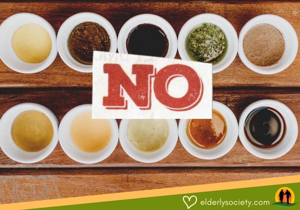 4. หลีกเลี่ยงการบริโภคอาหารที่มีน้ำจิ้มรสจัดและมีเครื่องปรุงรสเค็มเป็นองค์ประกอบ เช่น น้ำจิ้มไก่ น้ำจิ้มสุกี้และน้ำปลาหวาน เป็นต้น